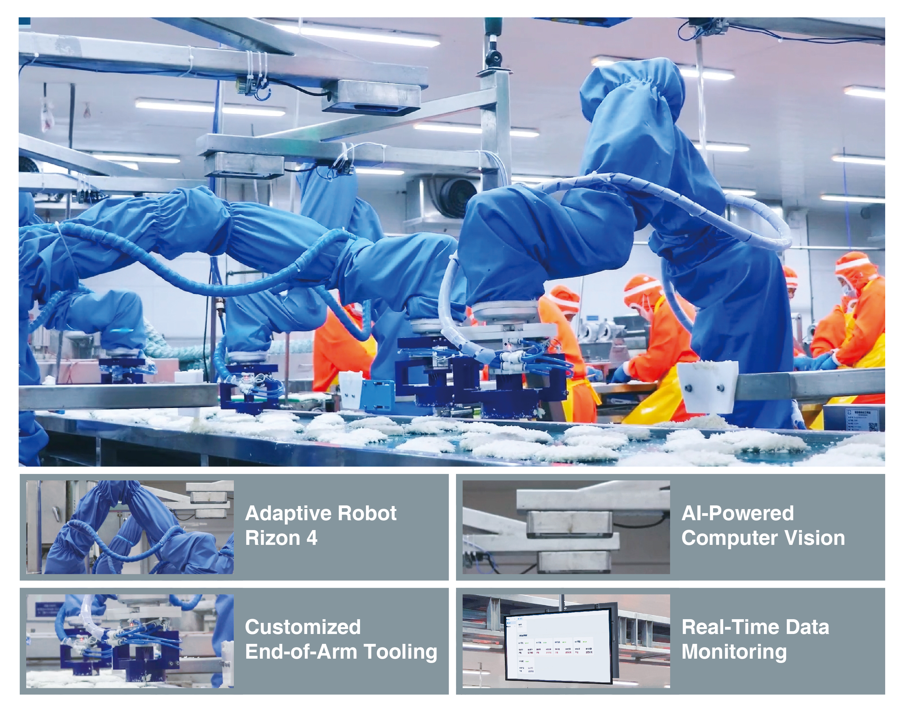 Solution: Flexiv's fully automated fish fillet shaping solution consists of a Rizon 4 adaptive robot, AI-powered computer vision, customized end-of-arm tooling, and a data monitoring system.